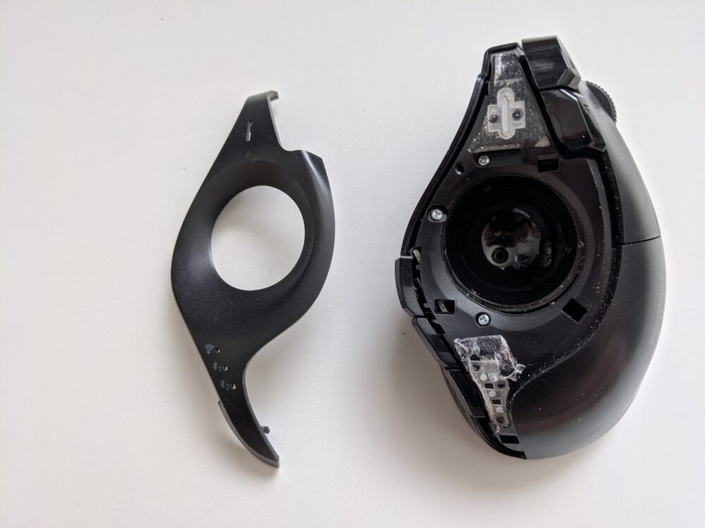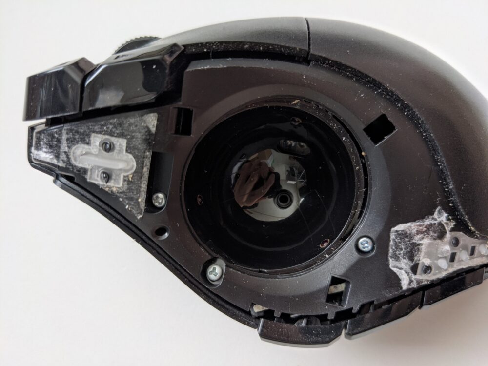 個人的に、このマウスの分解で最も困難なのは最初の外装パーツを外す工程だと思う。何箇所も爪で固定されているし、更に両面テープでも接着されてる。