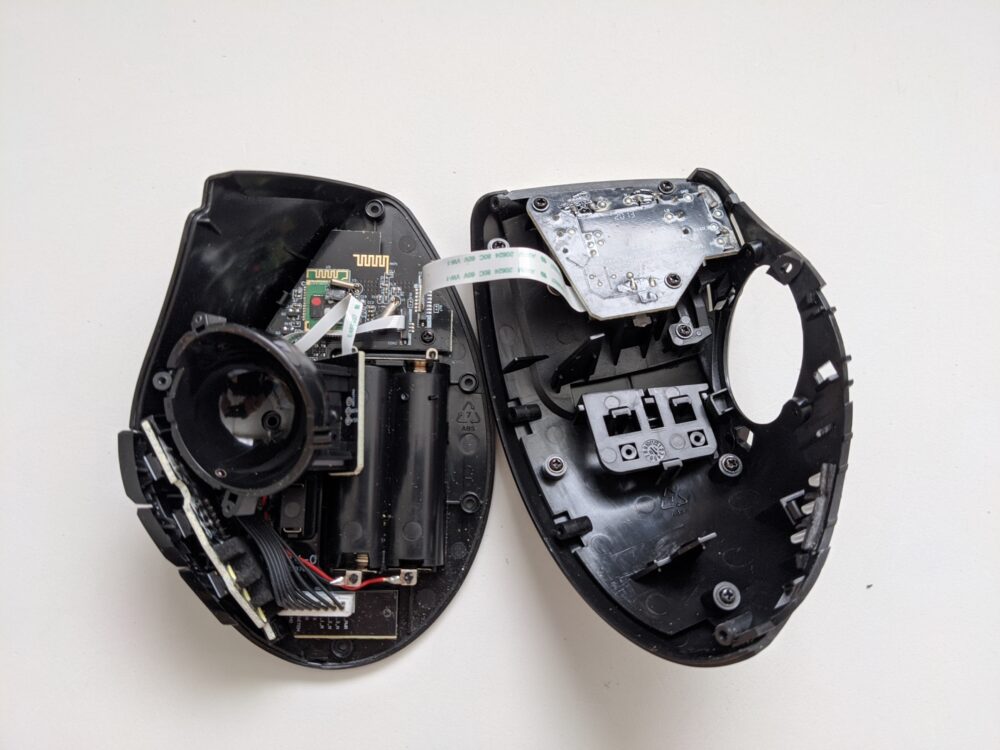 マウスを開くと太いフレキシブルケーブルが接続されているので抜きます。