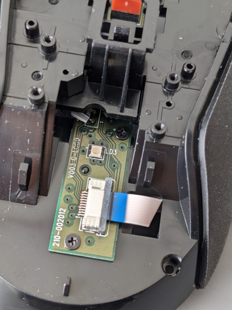 マウスの上部はツメで固定されているので軽くよじって外します。フラットケーブルで繋がっているので過度な負荷をかけないよう注意します。事前に抜いておいてもよいです。