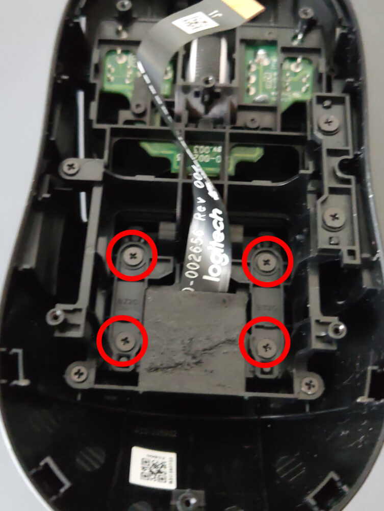 次に写真の赤丸部分のネジを+00ドライバーで外し、左右クリックスイッチを押す外装パーツを取り出します。