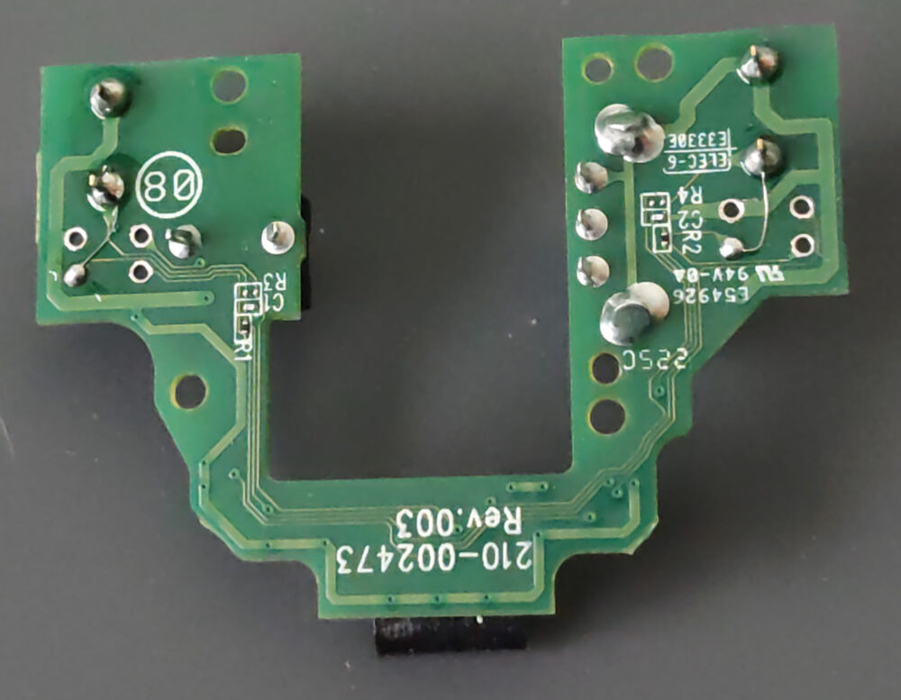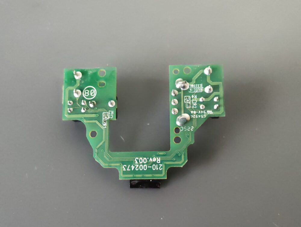 このマウスの左右クリックスイッチはオムロン製の光学スイッチが使われているので、静音スイッチへ交換するためには写真のようにジャンパさせる必要があります。