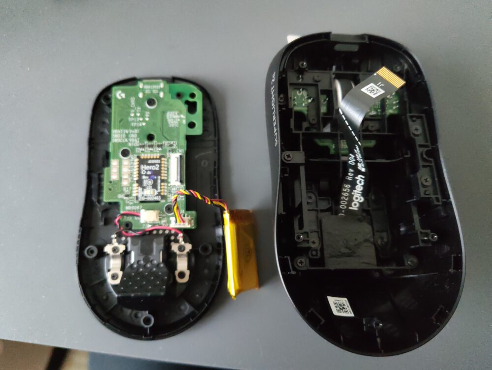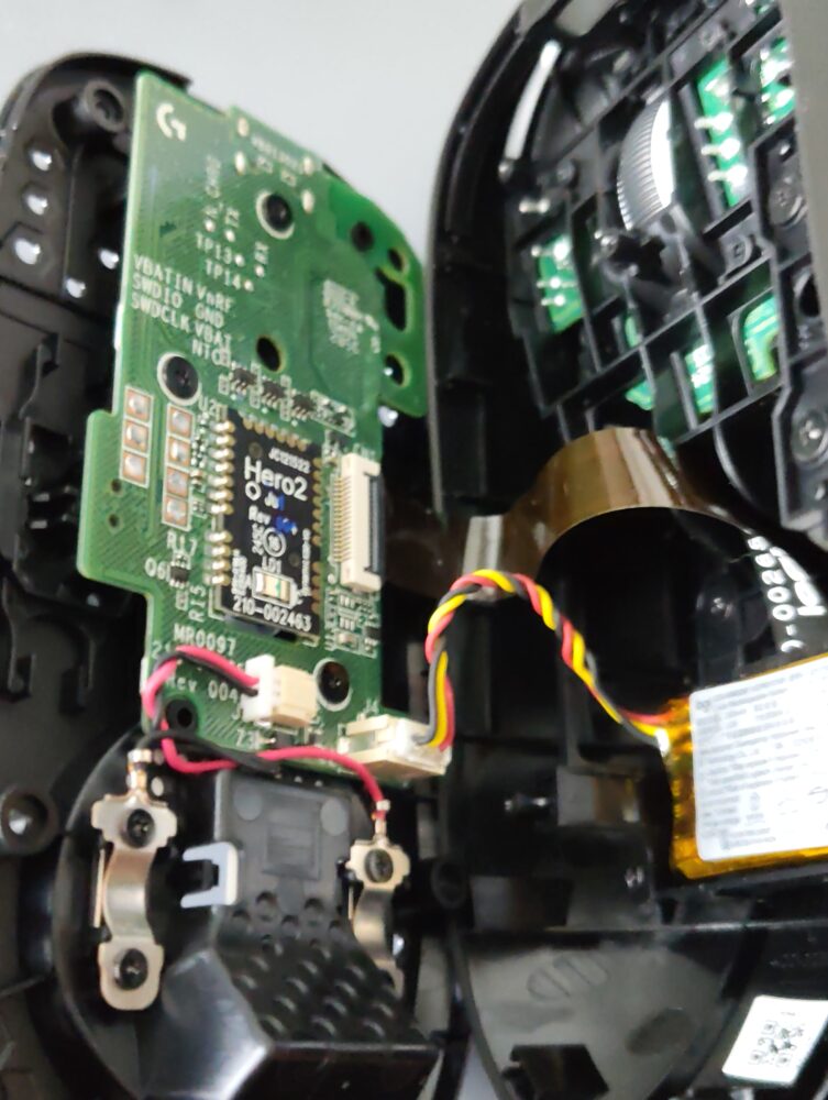 マウスを開封するとフラットケーブルとバッテリーコネクタのケーブルが接続されているのが確認できます。