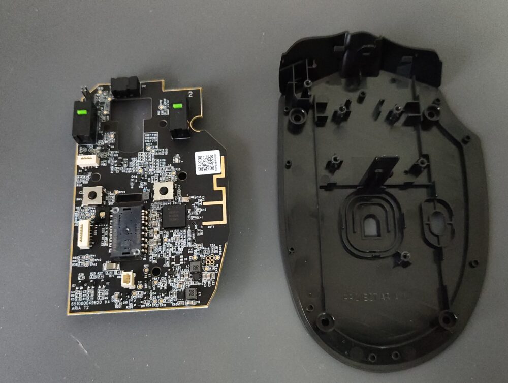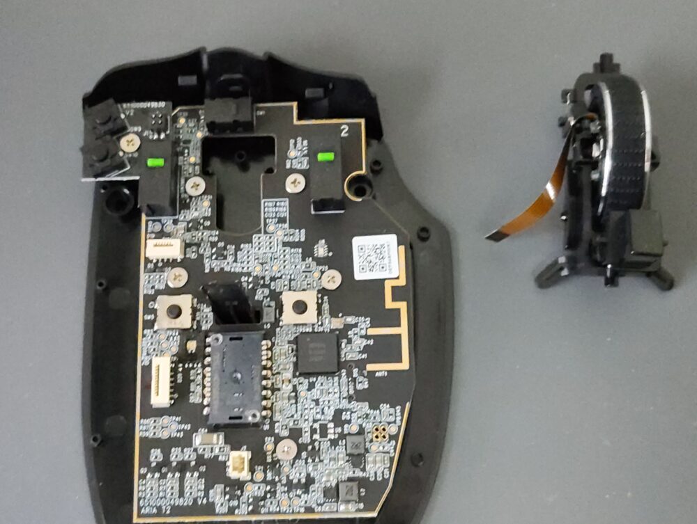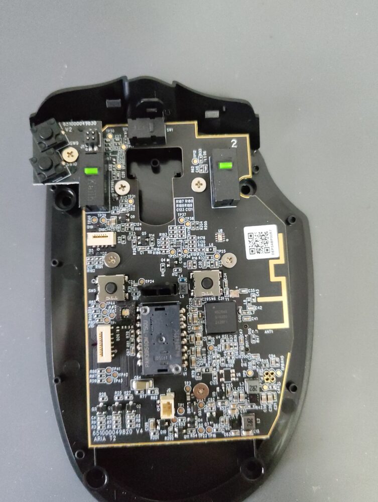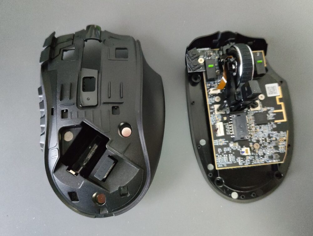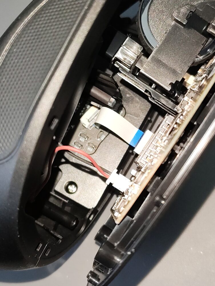 マウスを開くとサイドボタン基板に繋がっているフラットケーブルと、電池ボックスと繋がっているケーブルが見えるので抜いておきます。